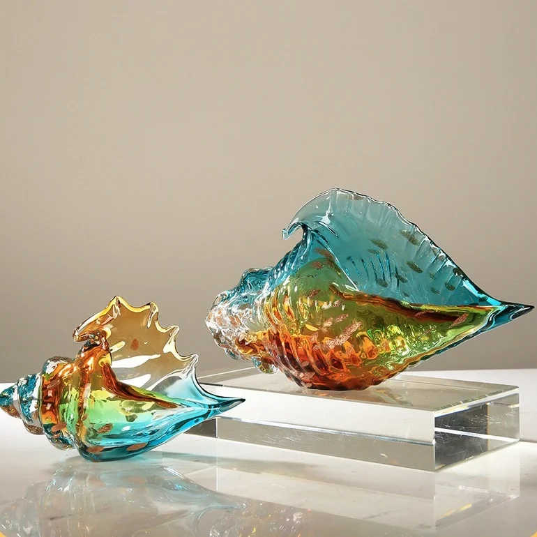 The charm of handmade glassware lies in the uniqueness of each piece. Craftsmen must precisely control the melting state of the glass under high temperatures, using blowing techniques to create the natural form of a conch shell. The blending of gradient colors demands meticulous control of both heat and raw materials. Embedding gold leaf is a complex task, requiring precise application while the glass is semi-solid, resulting in a luxurious, seamless blend of gold leaf and glass. This meticulous craftsmanship elevates this decorative piece beyond mere ornamentation, transforming it into a treasured piece of art to be passed down through generations.
