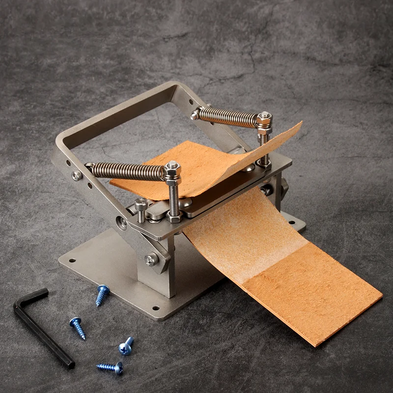 The clamping design, which combines a spring and a bolt, allows for flexible adjustment of the clamping force and range, firmly securing leather of varying sizes and thicknesses. This ensures the leather remains in a stable position during thinning, preventing slippage and shifting, ensuring safe operation and effective thinning results.