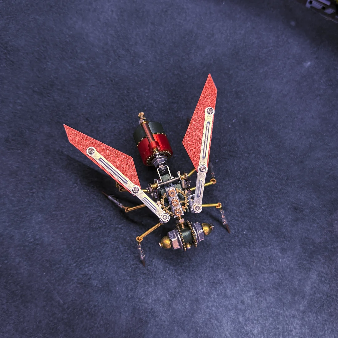 Wings: Crafted from vibrant red plate, with sharp edges and a rich texture. Connected to the main body via metal connecting rods, the screws and other components are clearly visible, showcasing the precision and rigor of the mechanical assembly, making it appear ready to flutter and dance at any moment.