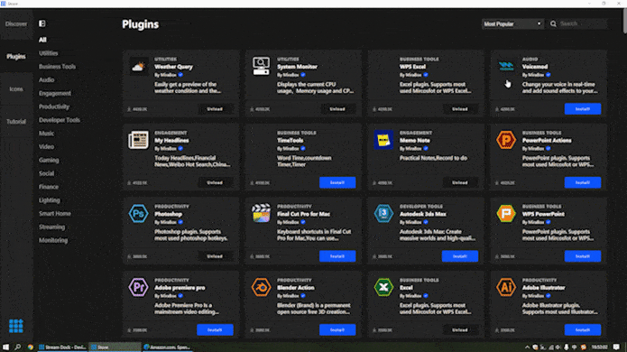 Plugins get your apps up and running with Stream Dock Slim in no time. OBS, Twitch, Twitter, XSplit, YouTube, Spotify. iCue, Philips Hue, LIFX, IFTTT. Zoom, PowerPoint, Keynote, Apple Mail, and loads more. Find them all in the Stream Deck Store, and get new plugins on the regular.