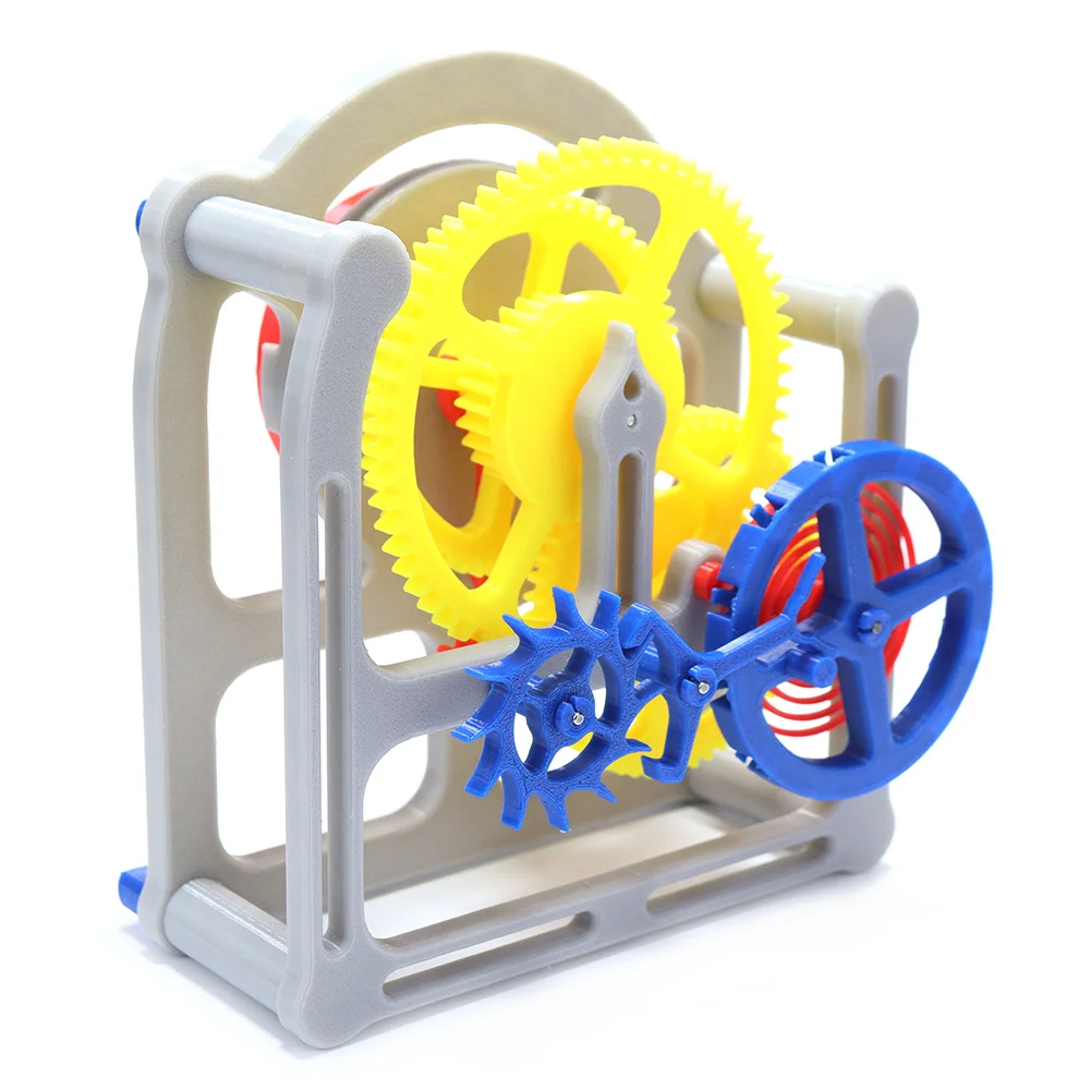 Using the classic gear escapement structure, it perfectly replicates the power transmission and timing control logic of a mechanical clockwork. Winding the mainspring releases energy in an orderly manner, driving the coordinated operation of the large yellow gear and the blue, specially toothed wheel. This clearly demonstrates how the escapement controls the gear speed, making the principles of mechanical clockwork "timekeeping" more abstract and easily understanding the secrets of power conversion and timing.